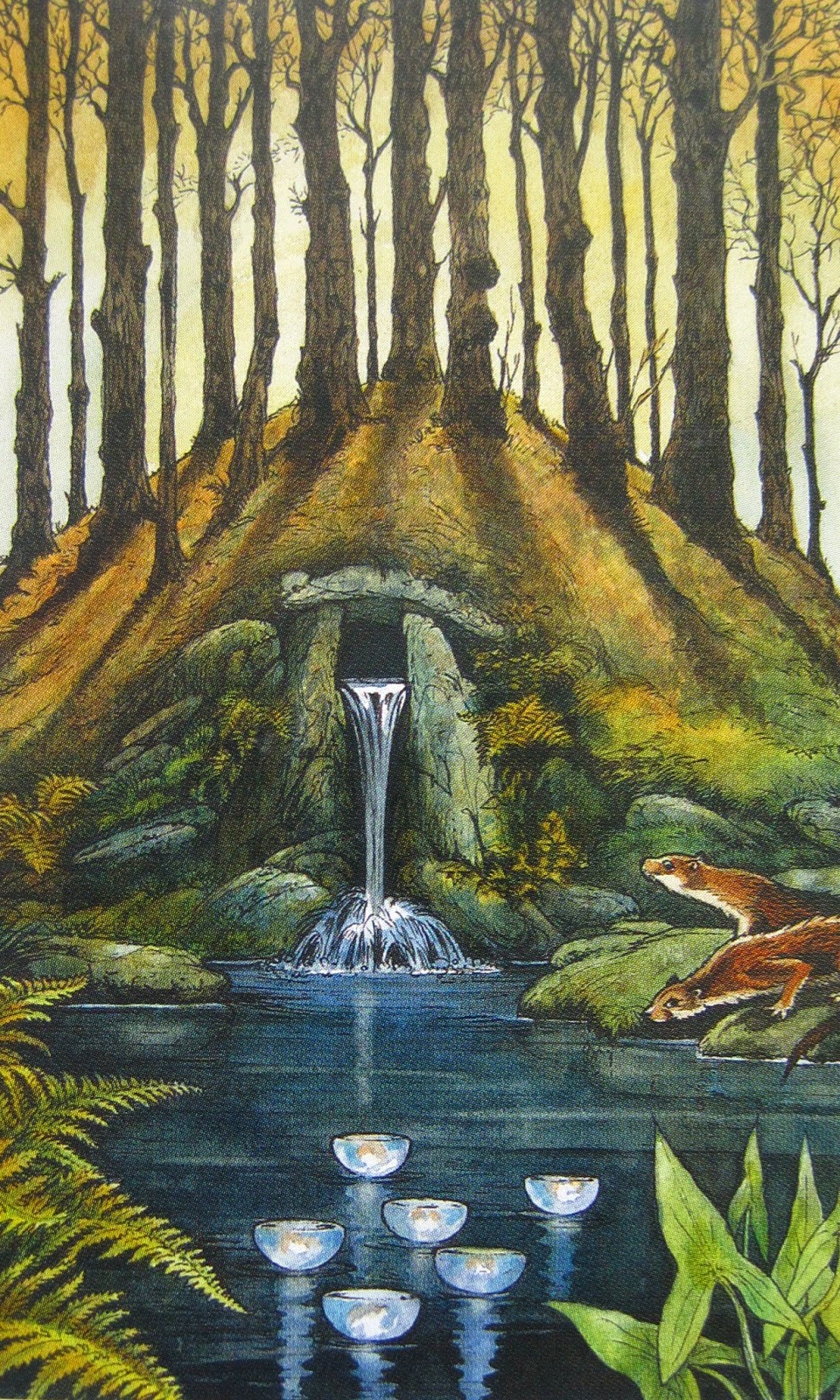 Outros exemplos que encontro de como um pilar se ergue no centro do Cosmos são a Lia Fail, no centro da província de Meath, aonde os reis estabeleciam suas cortes. Lia Fail é o menhir que grita sob os pés daqueles predestinados a serem reis e fora trazida pelos próprios deuses Tuathá de Danaan do Outro-mundo para este. Na mitologia galesa temos no conto Peredur son of Evrawc uma representação do Cosmos e do Caos na árvore que queima por completo de um lado e viceja do outro, à beira de um rio que separa o mundo dos vivos e dos mortos, o visível do invisível. De volta à Irlanda, a Fonte de Segais é descrita como o centro espiritual da ilha, de onde nascem os 7 rios principais do país. Também às margens desta fonte está uma árvore, agora uma aveleira, que despeja seus frutos portadores da sabedoria na fonte, tornando-a Segais (a Sábia), e de onde o herói Fion MacCumhall consumiu o Salmão da Sabedoria e tornou-se o homem mais sábio do mundo.